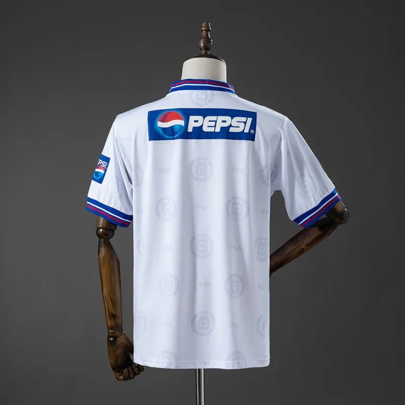 - Iconic Color Scheme: It features the classic and striking away colors of the era: a brilliant white base, symbolizing strength and purity, dramatically accented with the famous Cruz Azul royal blue on the sleeves and iconic collar.
