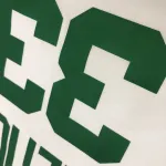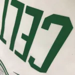 - Authentic Colors & Logos: The crisp white base is prominently featured with the iconic Celtics green and gold accents. The classic leprechaun team logo is proudly displayed on the upper left chest, with the distinctive “Celtics” wordmark arched across the front in timeless green lettering.
