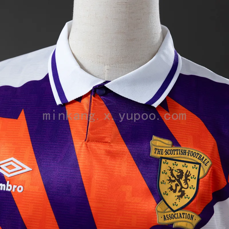 This fan-version jersey features the distinctive abstract chest pattern and vibrant color scheme that made the original so unforgettable. The Scotland team famously qualified for the 1992 European Championships wearing this design, making it a must-have for any true collector of football memorabilia.