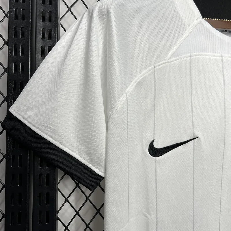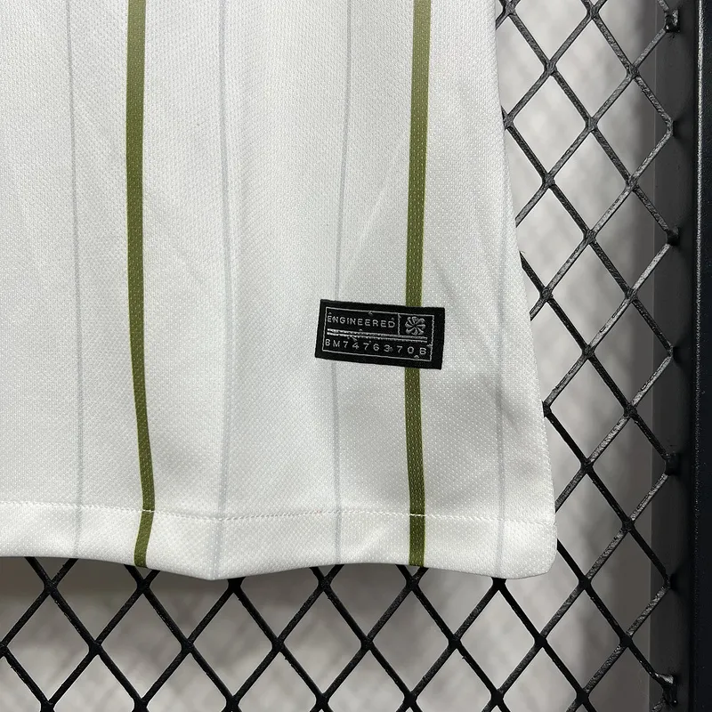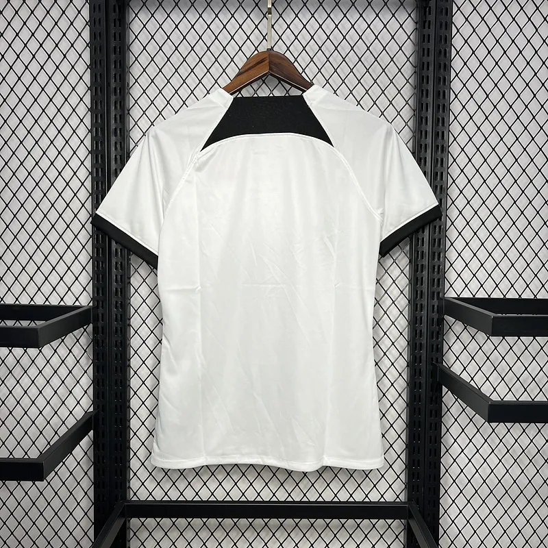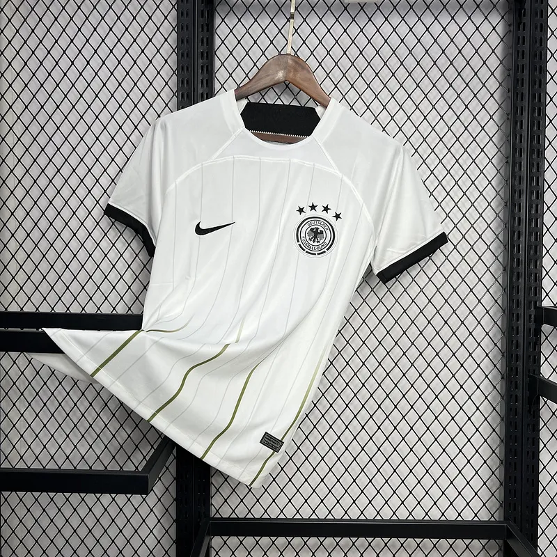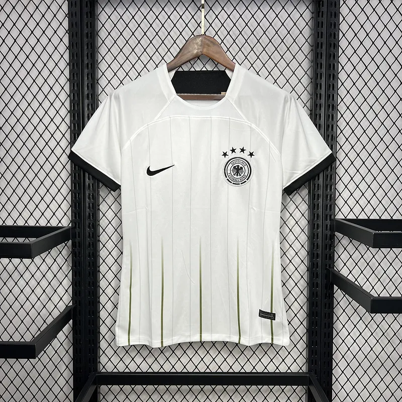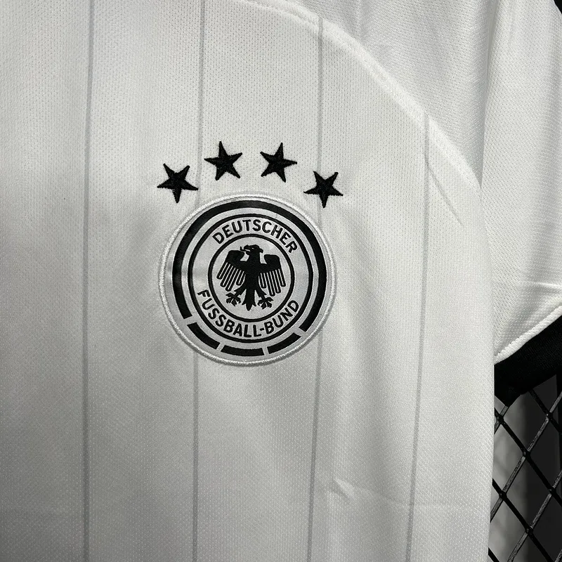 Celebrate Germany’s quest for glory in this stunning Germany 2024 white jersey – a special edition masterpiece designed for true supporters. Crafted with lightweight, breathable fabric, it features advanced moisture-wicking technology to keep you cool and comfortable whether you’re cheering in the stands or showcasing national pride on the streets. The sleek white base is accentuated by bold geometric patterns in black and red, echoing the iconic German flag, while gold-toned buttons and contrast trim add a touch of elegance.