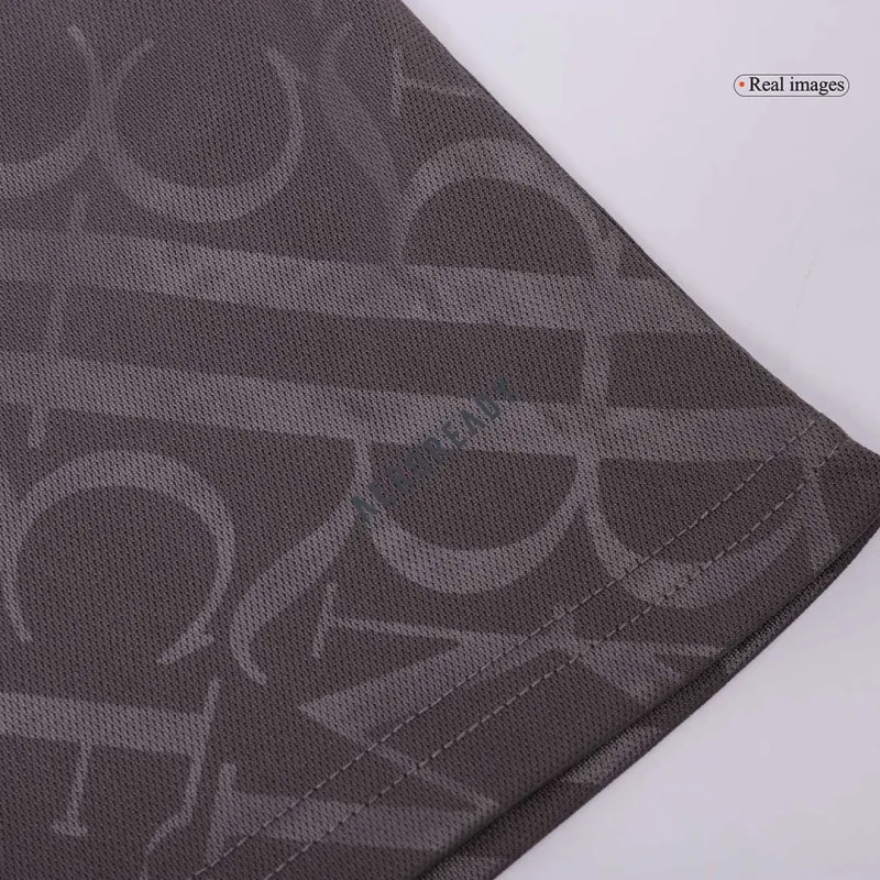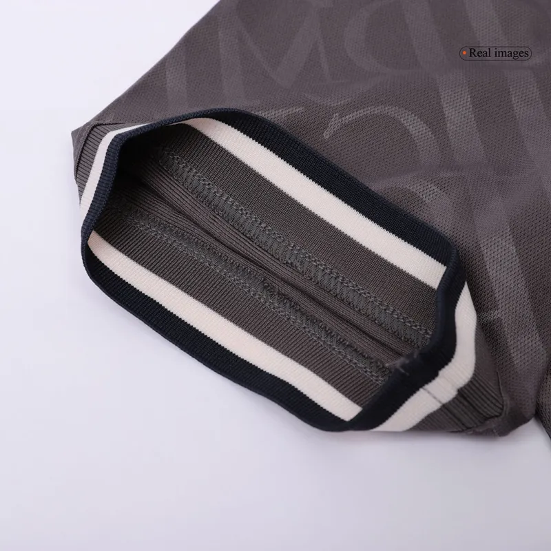This third away kit presents a bold and sophisticated aesthetic, designed to make a statement on the road. The design features a distinctive tonal pattern that adds depth and texture, creating a dynamic visual effect under the stadium lights. The classic Real Madrid crest is proudly displayed on the chest.