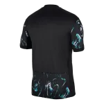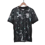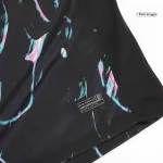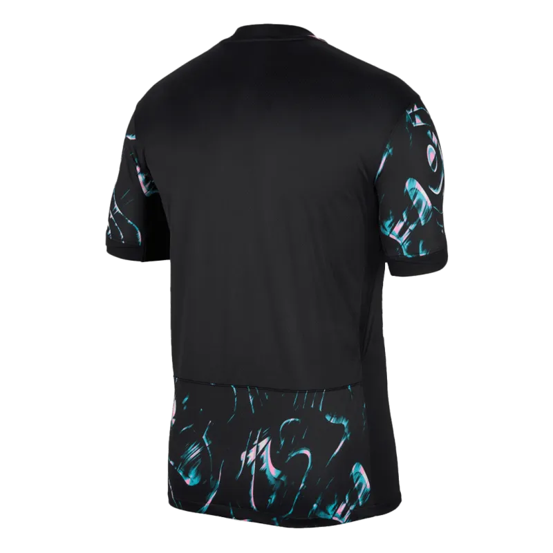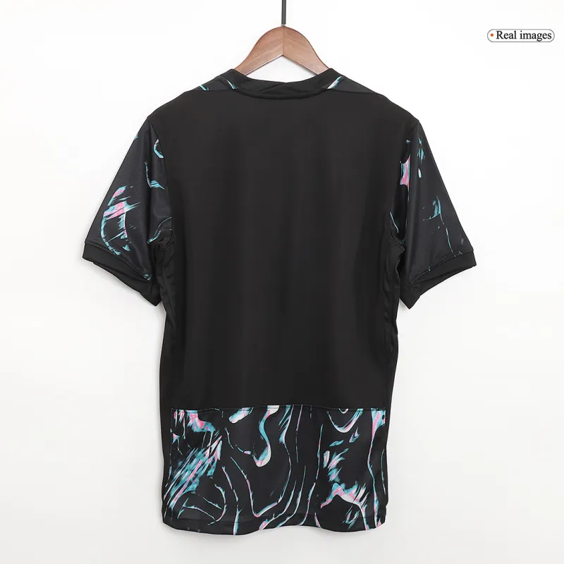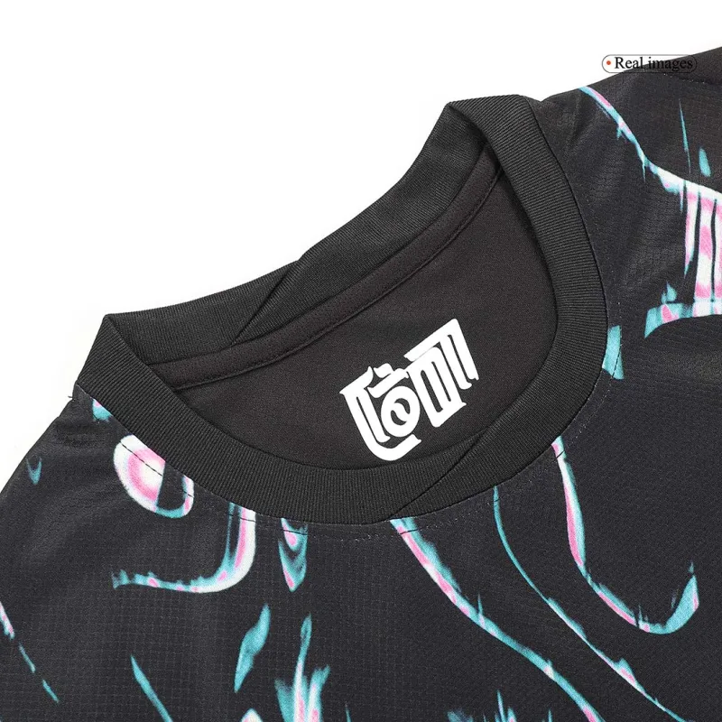 This fan version jersey presents a bold and contemporary visual identity. The 2024 away design moves away from traditional colors, featuring a striking and sophisticated deep charcoal gray base. This modern canvas is dramatically overlaid with a dynamic, abstract pattern of sharp, fiery red lines. This design is inspired by the concept of “Faster, Higher, Stronger,” representing the team’s explosive speed, soaring aspirations, and formidable strength on the pitch.