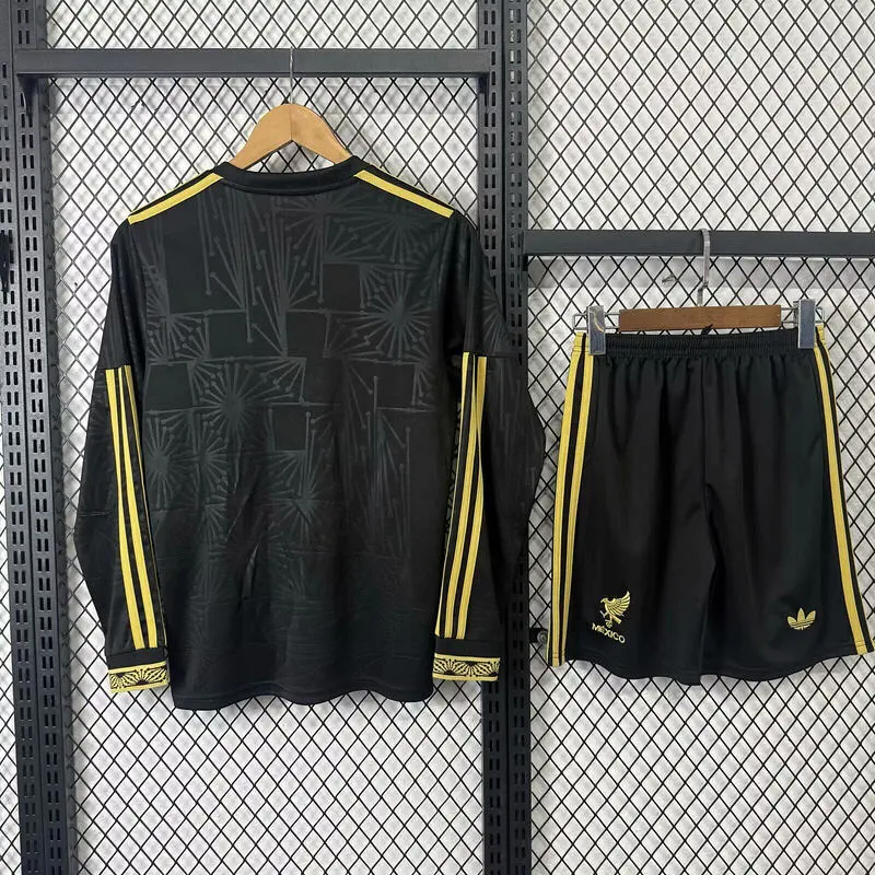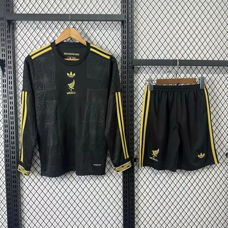 Introducing the exclusive 2025 Mexico Black & Gold Long Sleeve Jersey – designed for young fans who dream big! Inspired by the national team’s iconic style, this limited-edition uniform blends striking aesthetics with unmatched comfort for every aspiring soccer star.