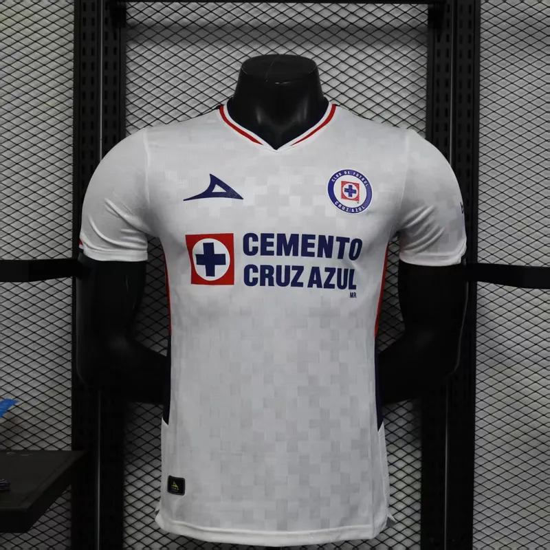- 🔥 Vibrant Navy & Crimson Accents: Striking away colors inspired by Cruz Azul’s iconic identity, featuring the classic vertical stripes and modern geometric trim.