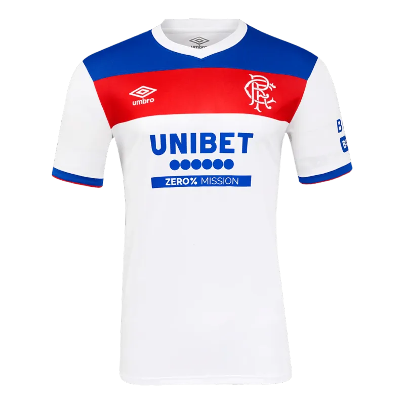 This jersey makes a bold statement with its sophisticated and contemporary aesthetic. The design features a clean, light base color, providing the perfect canvas for the distinctive contrasting details that Rangers are known for.