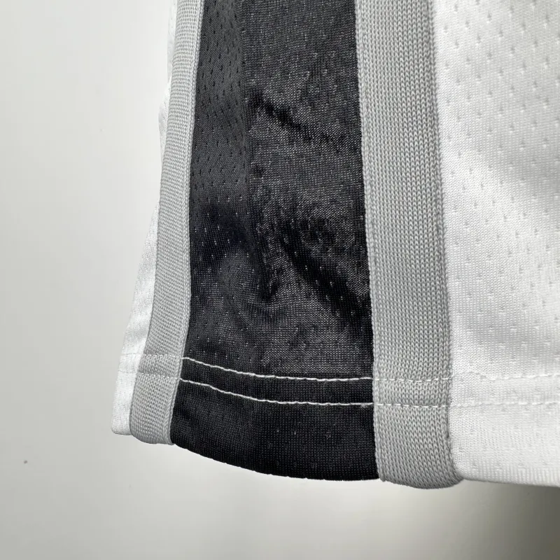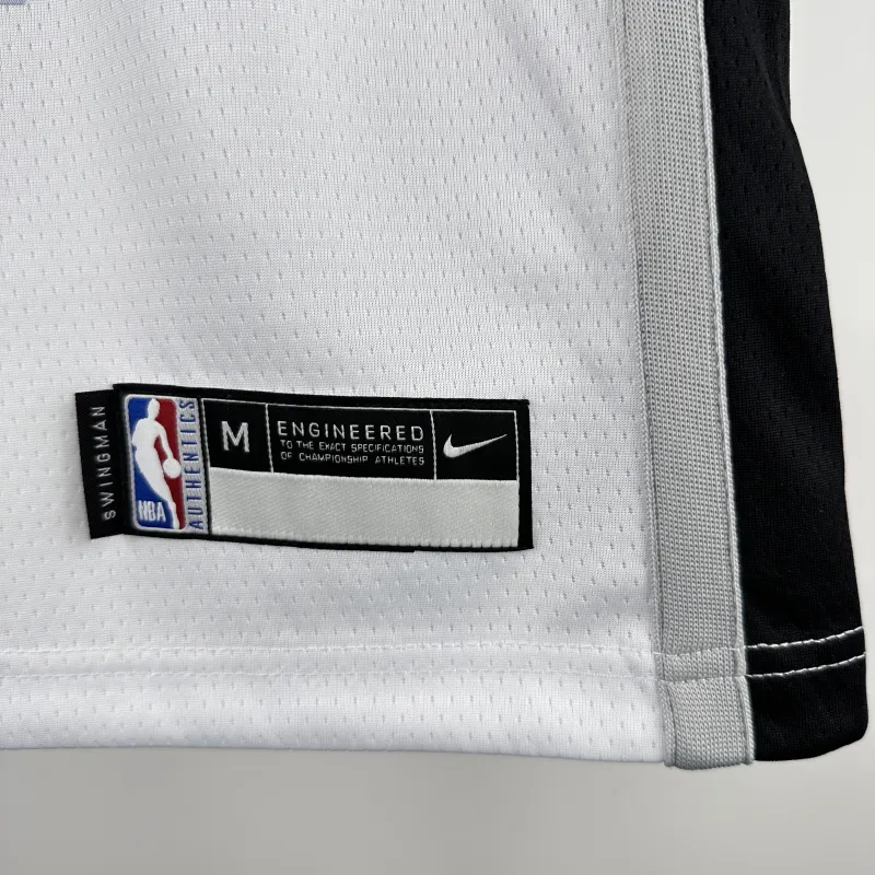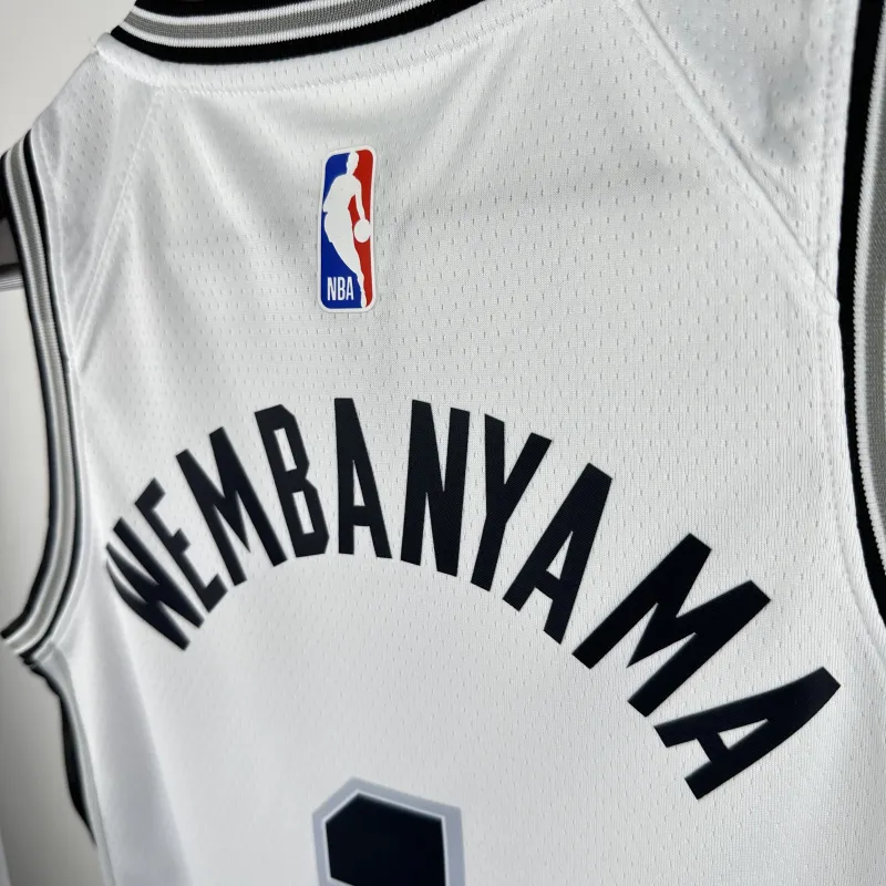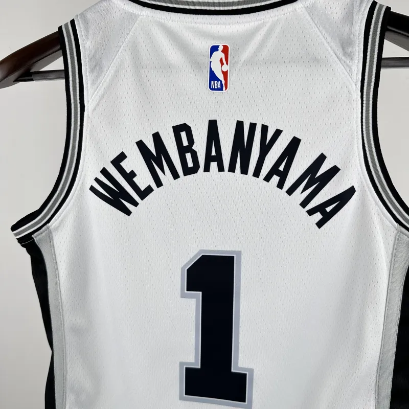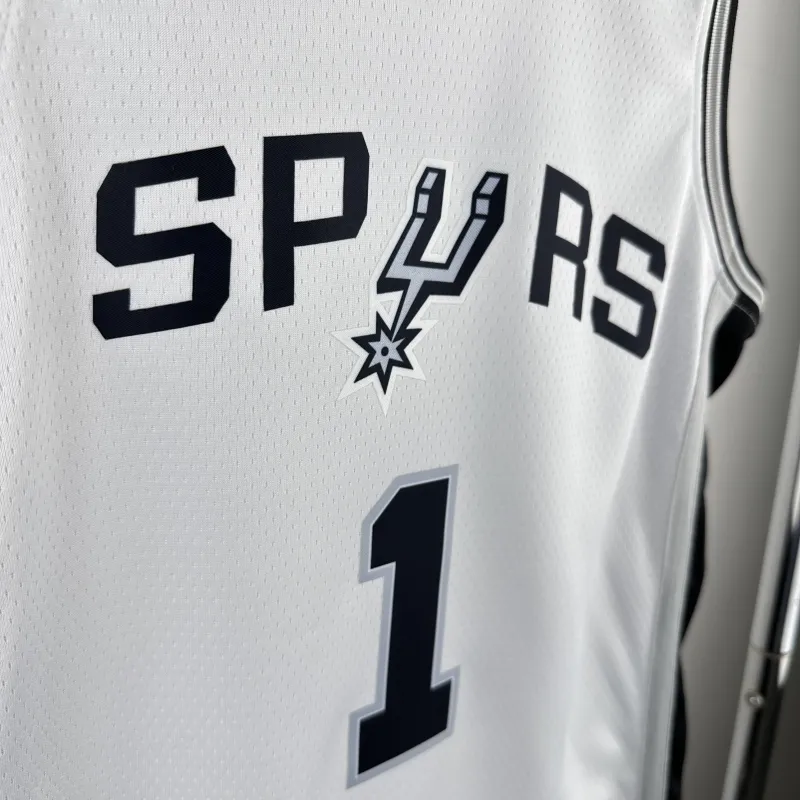 This jersey captures every detail that makes the Spurs’ classic white uniform legendary. It features the timeless silver and black team colors, with the distinctive spur logo proudly displayed on the left leg of the shorts design. The player’s name, “WEMBANYAMA“, and his iconic #1 are prominently showcased in the Spurs’ bold lettering and numbering.